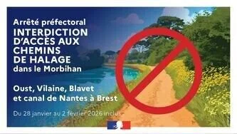 Chemins de halage Interdiction d acces a compter du 28 janvier 2026 dans le Morbihan_largeSuite aux crues intervenues sur plusieurs cours d’eau du Morbihan ces derniers jours, et qui ont pu fragiliser voire dégrader les abords de ceux-ci, le préfet du Morbihan a pris ce 28 janvier 2026, un arrêté d’interdiction d’accès aux chemins de halage de l’Oust, de la Vilaine, du Blavet et du canal de Nantes à Brest entrant en application à compter de ce mercredi 28 janvier 2026 à 18h et jusqu’au lundi 2 février 2026 inclus.